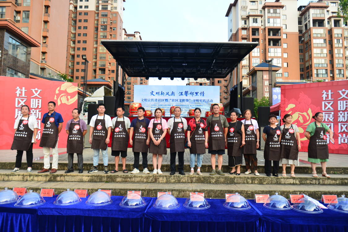 涼拌牛肉、盤龍草魚、海鮮粉絲煲、青椒小炒肉……舞臺下,居民有序排隊領(lǐng)取參賽美食,一邊品嘗一邊交流做菜心得,歡聲笑語充斥著整個活動現(xiàn)場。