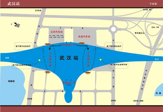 武漢站的設(shè)計采用四層的立體結(jié)構(gòu)。最上面一層為候車區(qū)和售票區(qū),下面一層為乘車區(qū),檢票后,旅客可以乘電梯直接下到動車旁。再下面為地面層,用于旅客出站以及社會車輛停車。最下面一層為地下層,為地鐵準備,目前正在施工中。
