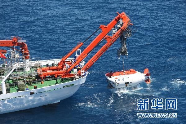 這是“蛟龍?zhí)枴鄙詈]d人潛水器于2010年7月在中國南海執(zhí)行一次成功下潛后出水。 新華社發(fā)(中國大洋協(xié)會(huì)供圖)