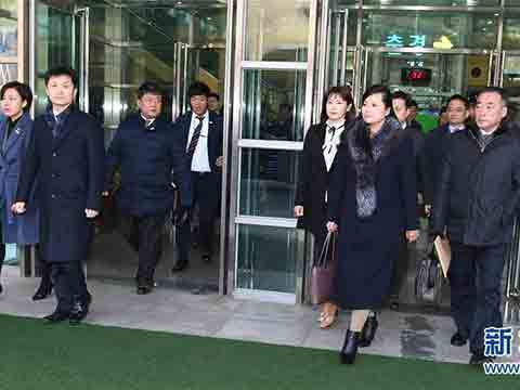 1月21日,朝鮮三池淵管弦樂團團長玄松月(前右二)通過朝韓邊境的韓國京畿道坡州市京義線韓朝出入境事務所前往韓國首爾。當日,朝鮮方面派遣三池淵管弦樂團團長玄松月率領的考察團經(jīng)由京義線陸路抵韓,為平昌冬奧會之際舉行的文藝演出進行事先考察。(新華網(wǎng))