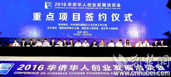 湖北日報訊(記者周呈思)昨日上午,在2016華僑華人創(chuàng)業(yè)發(fā)展洽談會重點項目簽約儀式上,數(shù)十位中外簽約代表分三組上臺,集中簽約29個項目,包括10個人才項目、19個投資項目,其中投資過億元的項目達18個。