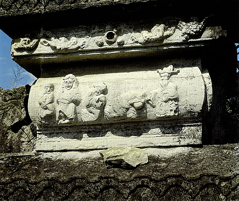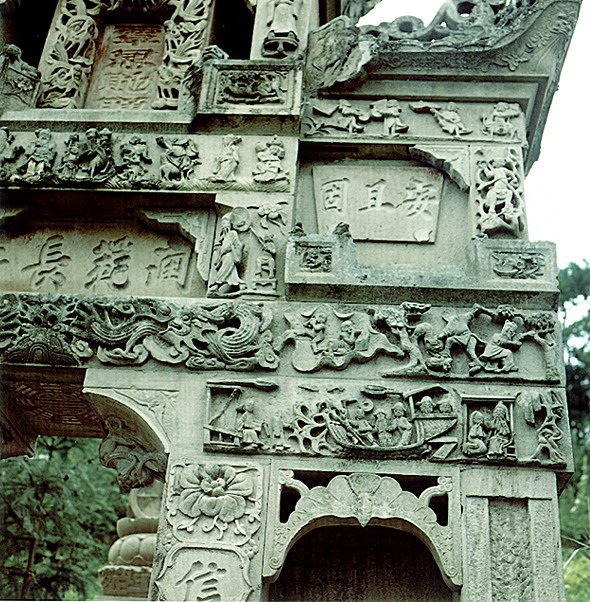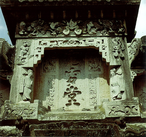 石雕 湖北省北有秦嶺東沿的武當(dāng)山、大別山、桐柏山,西接云貴高原,東南為幕阜山脈環(huán)繞,中部是寬闊的江漢平原。山區(qū)產(chǎn)石料,為石雕提供了豐富的用材;平原燒泥土制磚瓦,鐫以圖案美化建筑。民間石雕、磚雕分布,與地形大體一致。保康石雕題材廣泛,大致分為日常生活、倫理教化、神話傳說、戲文故事、花鳥蟲魚、書文楹聯(lián)六類。