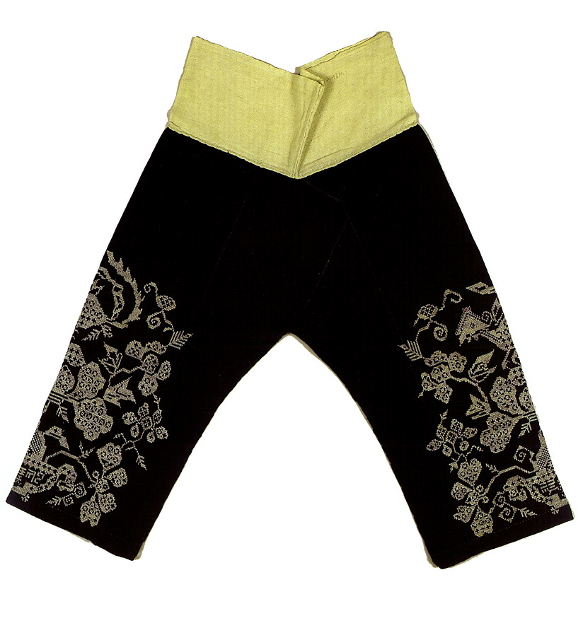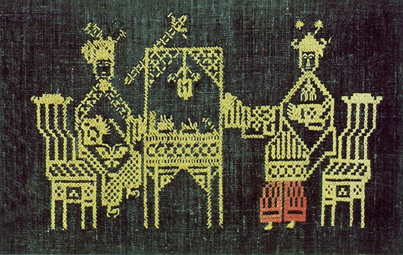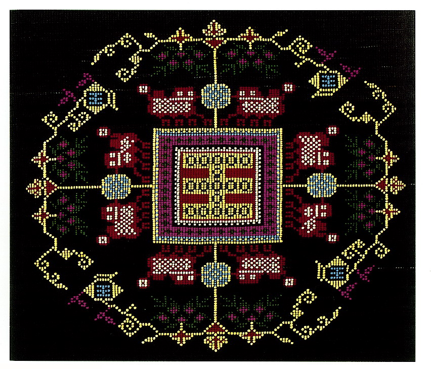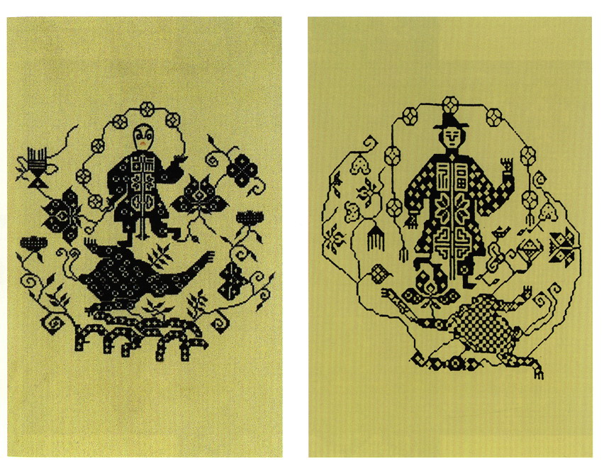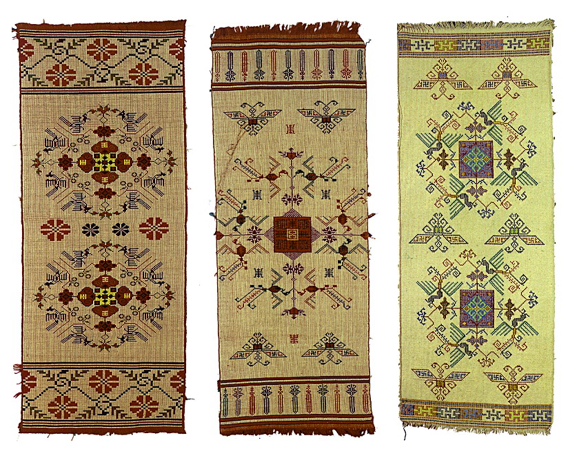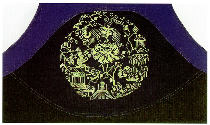 挑花針法有平挑花和十字花兩種,即在平布上面依紗眼用繡花針扣上十字形,然后以此為骨架,填置上多種需要花紋,采取反面挑花正面看手法,其優(yōu)點(diǎn)有二:一是保持清潔;二是便于打結(jié)。構(gòu)圖多是幾何圖形,也有動植物的幾何圖案。其結(jié)構(gòu)主要有對稱式、交叉式、二方連續(xù)式、斜菱形、單獨(dú)紋樣等等。圖案花紋既規(guī)整而又變化多姿,給人以舒暢愉快的感覺。
